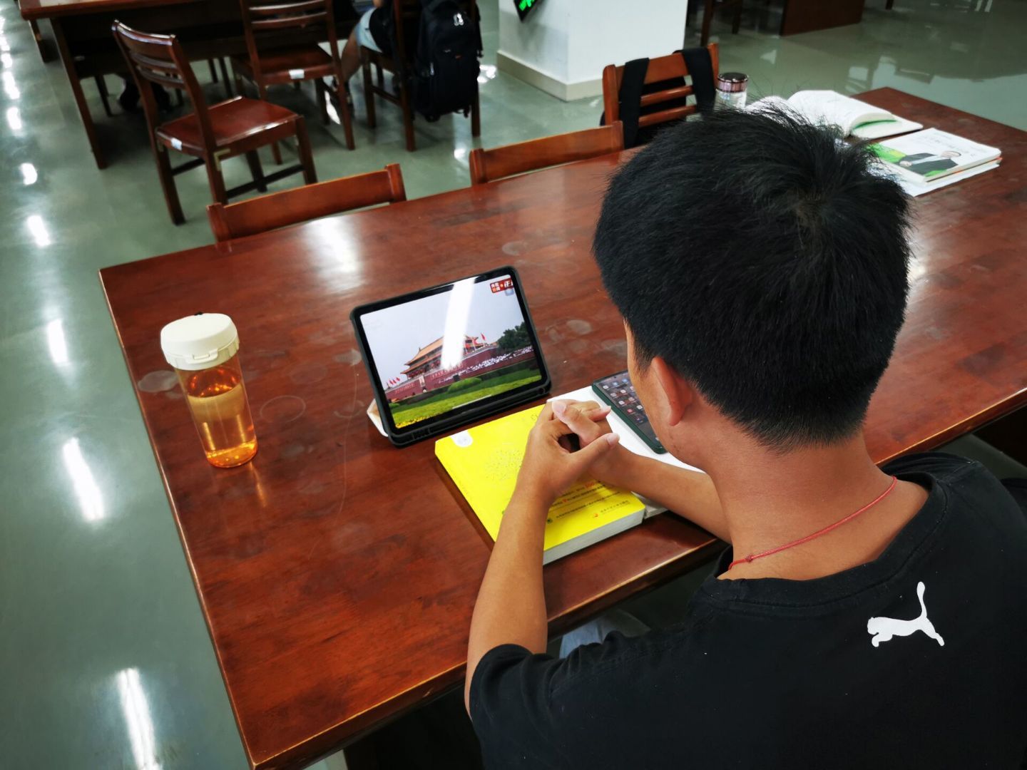 学院学生在宿舍和图书馆观看实况直播