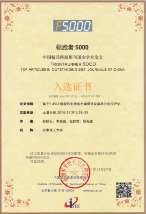 近日,由国家科技部中国科技信息研究所举办的“2021年中国科技论文统计报告发布会”通过网络直播方式举行,会上公布了“领跑者5000 ——中国精品科技期刊顶尖学术论文(F5000)”入选情况。我院赵明松副教授予2016年1月发表在我国土壤学科领域高水平学术刊物《土壤学报》上的《基于RUSLE模型的安徽省土壤侵蚀及其养分流失评估》论文,经过定量分析遴选和同行评议推荐,入选“领跑者5000-中国精品科技期刊顶尖学术论文”(简称“F5000”)。