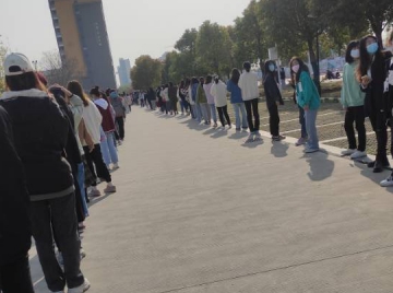 上午八点,作为团支书的吴亚玲组织班级女生到图书馆前集合,学校开始了第四轮核酸检测。大家带上身份证、学生证,全程佩戴好口罩,自觉排队,保持一米以上的安全距离。学院领导、辅导员全程陪同,维持现场秩序,操场内保安叔叔拿着喇叭指挥同学们要保持间距,帐篷下的“大白”们重复着手上的工作,每个人都在各自的岗位上坚守着,确保第四轮核酸检测的正常进行。