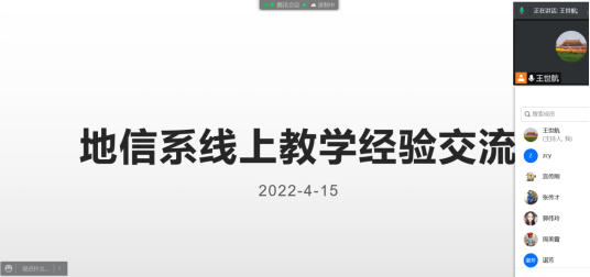 为总结前一阶段的线上教学工作,地信系在基层教学组织教研活动中,针对线上教学设计、课堂组织、教学成效等方面的经验和心得,以及线上教学理念、特色与创新做法等,积极开展研讨交流;王世航老师以“基于超星“一平三端”+腾讯会议的《地图学基础》线上教学”为题做了经验交流。后续地信系将坚持典型示范、教学创新、持续改进,组织开展线上示范教学观摩、线上教学示范课堂评选、线上教学质量标准制定等活动,确保全体教师共同进步。
