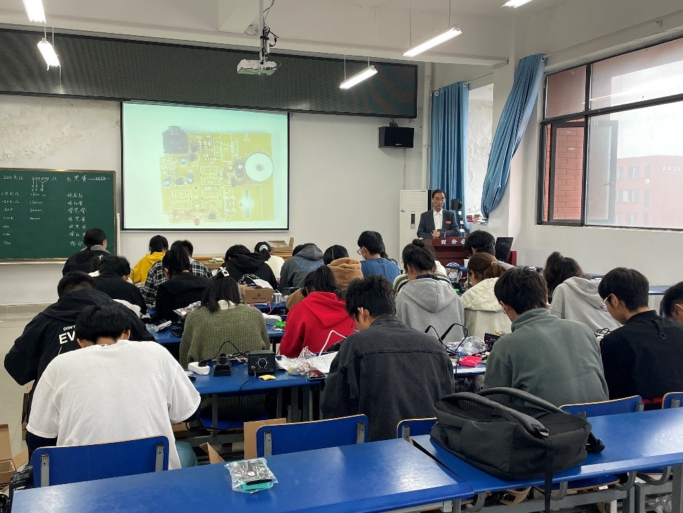 赛前,指导老师对比赛事项进行了说明,随后各参赛选手在规定时间内开始制作S66E型收音机,比赛过程中参赛选手们沉着冷静,参照线路图将元器件一一对应,快速穿插孔洞,熟练点焊固定。40分钟后第一位选手完成焊接,其他选手在规定时间内陆续完成比赛项目。所有参赛作品经评委老师检验和测试后,均符合规定要求,现场评委会也根据作品的制作质量和耗时长短择优评出各级奖项。