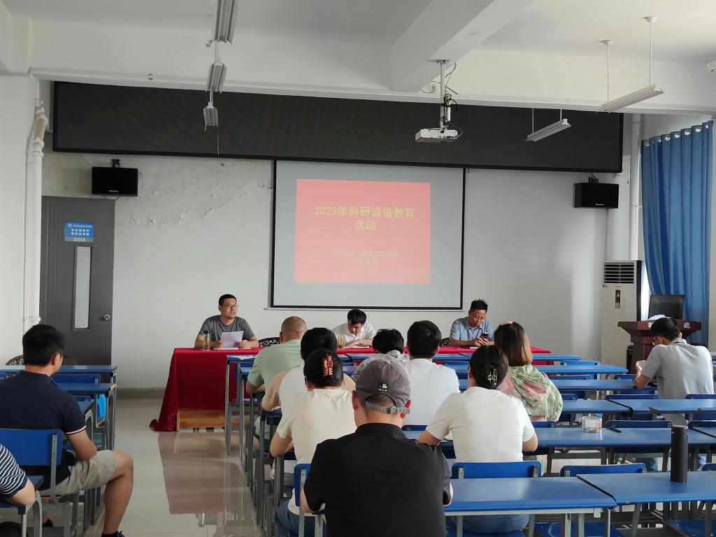 6月15日上午在学院北512会议室开展2023年科研诚信教育活动,参会人员主要包括全院教师、研究生代表等,赵兴旺领学了《安徽理工大学科研诚信管理办法(试行)》、《国家自然科学基金项目评审请托行为禁止清单》等文件,通报了近年来的多起学术不端行为案例处理决定,强调科研诚信的重要性。随后师生一起观看了学术不端警示教育片“‘抄人’现形记”,视频展现了科研失信行为给科研工作带来的危害,警醒全院师生要严守学术道德底线、诚实诚信做科研。随后在场师生签署了《安徽理工大学科研诚信承诺书》。