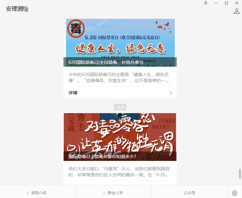 发布禁毒日专题推文。学院充分利用微信公众号“安理测绘”平台,围绕禁毒英雄事迹介绍和禁毒法规相关案例,图文并茂地向大学生普及毒品的种类及危害,同时宣传英雄事迹,感受先烈勇敢无畏、不屈不挠的禁毒精神,号召大家学习铭记。