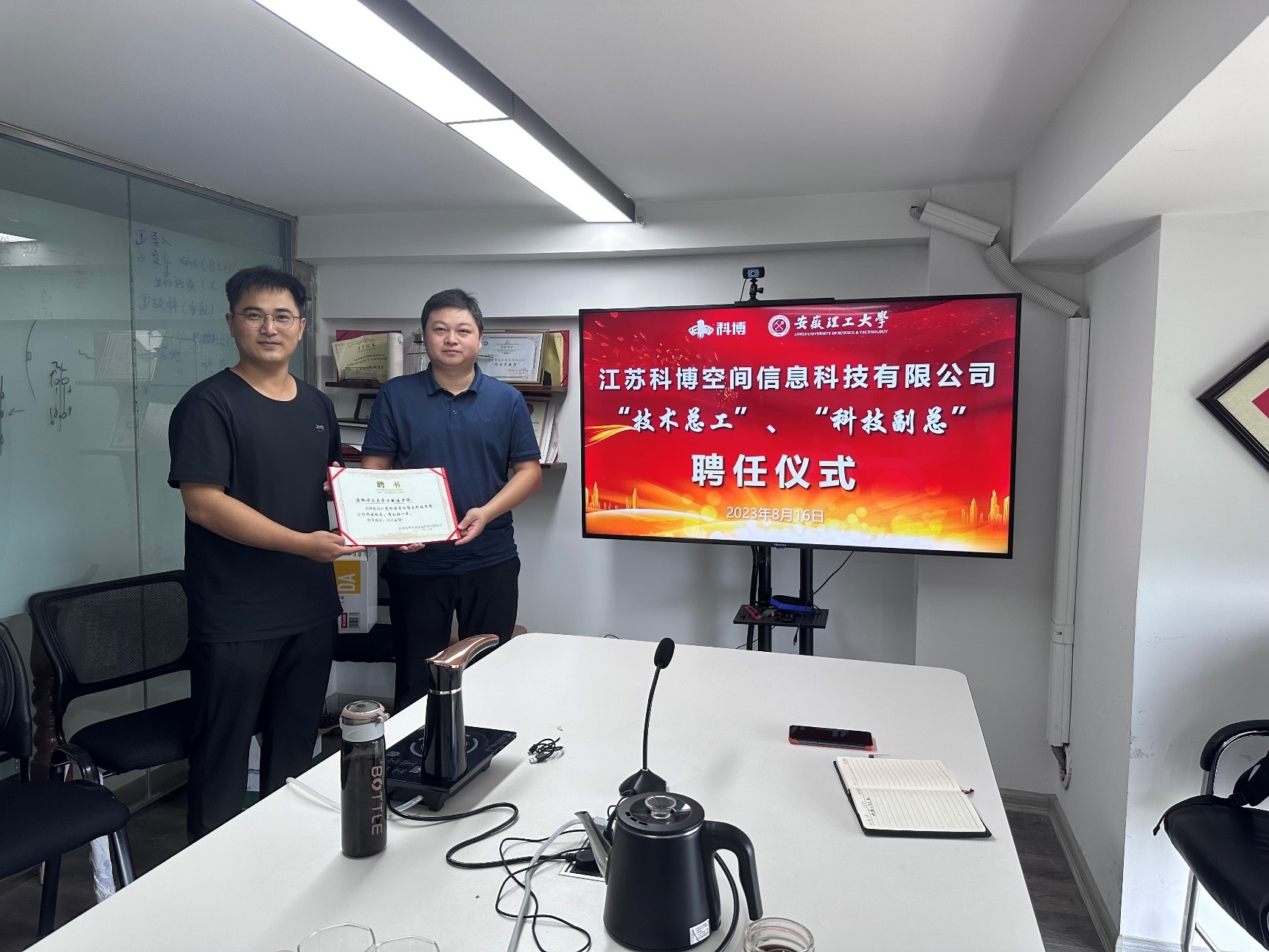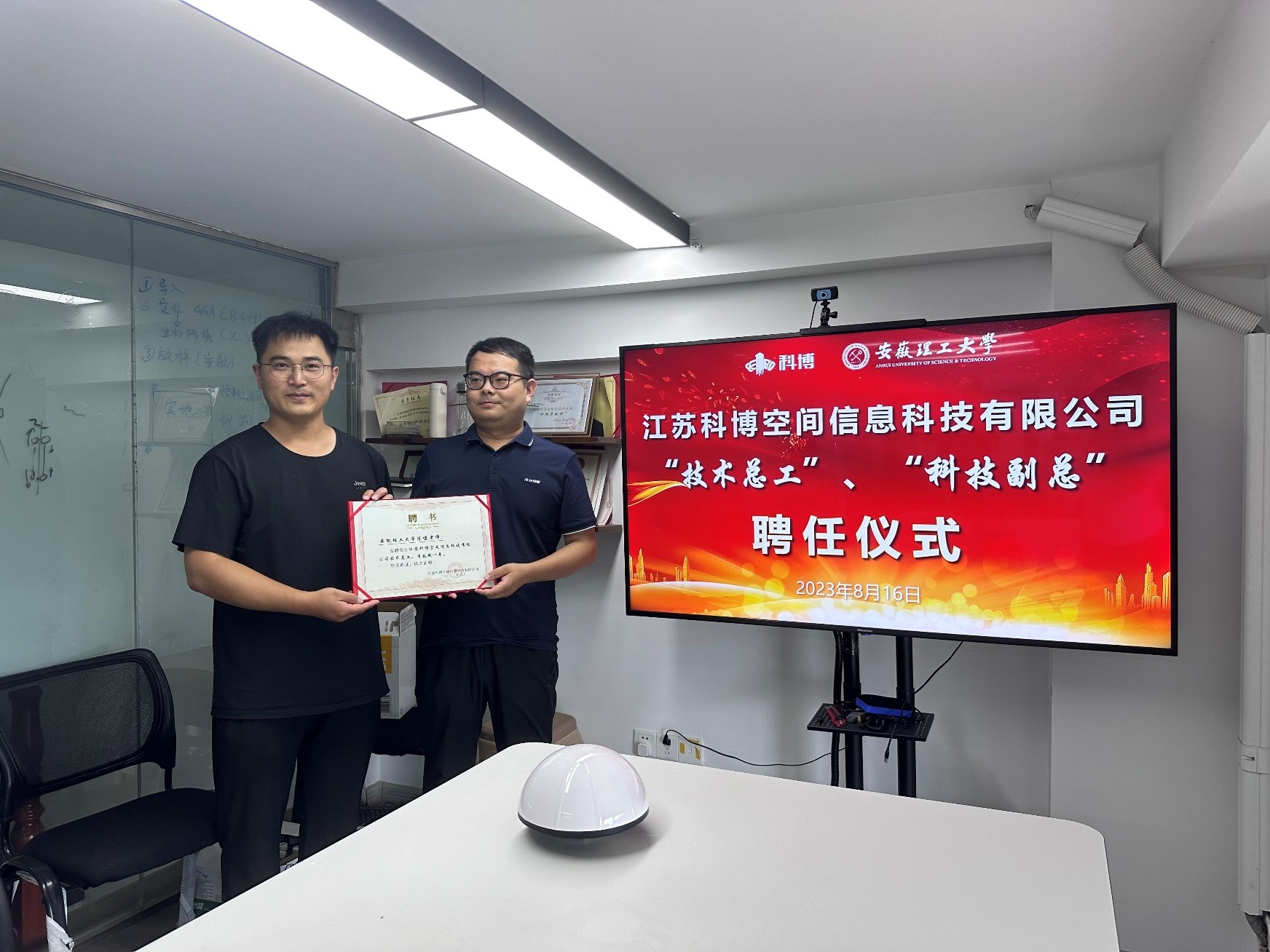 江苏科博空间信息科技有限公司技术部负责人王明明介绍了公司概括、北斗多源智能安全监测等业务,并就科技创新和岗位设置等进行了探讨。为了加强校企深度融合,促进科技协同创新,王明明为我院青年教师颁发了企业挂职聘书。