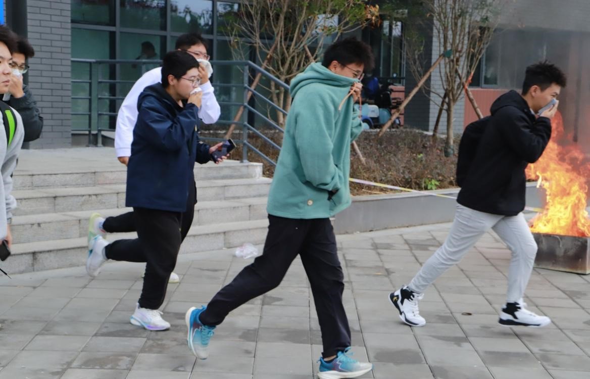 中午13:20警铃响起,“疏散逃生”开始。“浓烟”从平苑4号楼下冒出,楼道内消防警笛响起,“请疏散撤离”的提示响彻楼道内,学生在辅导员与宿舍管理员的指挥下,手持湿毛巾捂住口鼻,俯身弯腰,穿过浓浓的模拟烟雾,快速从各个疏散通道、安全出口撤离至应急避险集结地。最先抵达的班级用时仅2分钟,其他班级都在3分钟上内安全抵达。整个演练过程紧张、有序,演练环节衔接紧密、处置规范,达到了预期目标和效果。