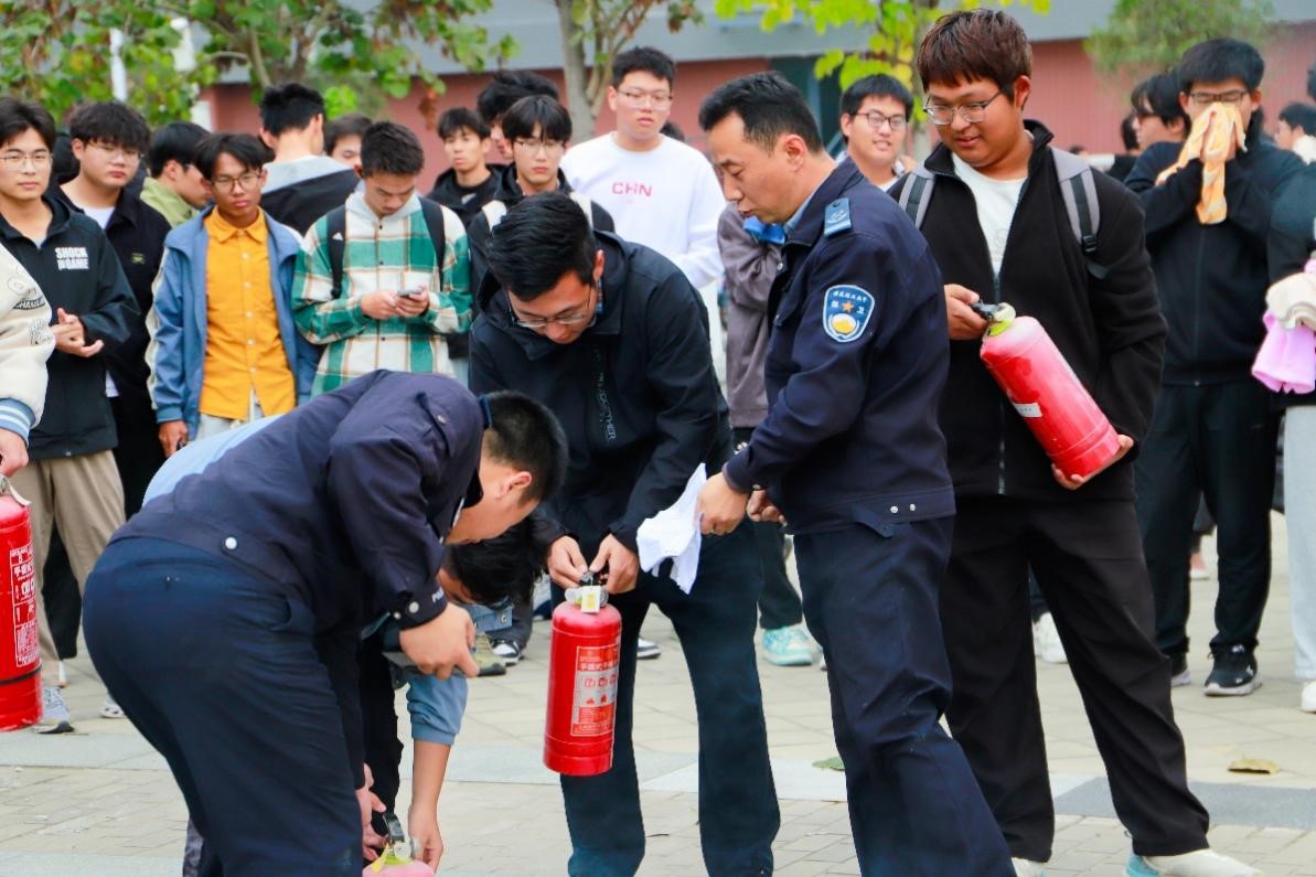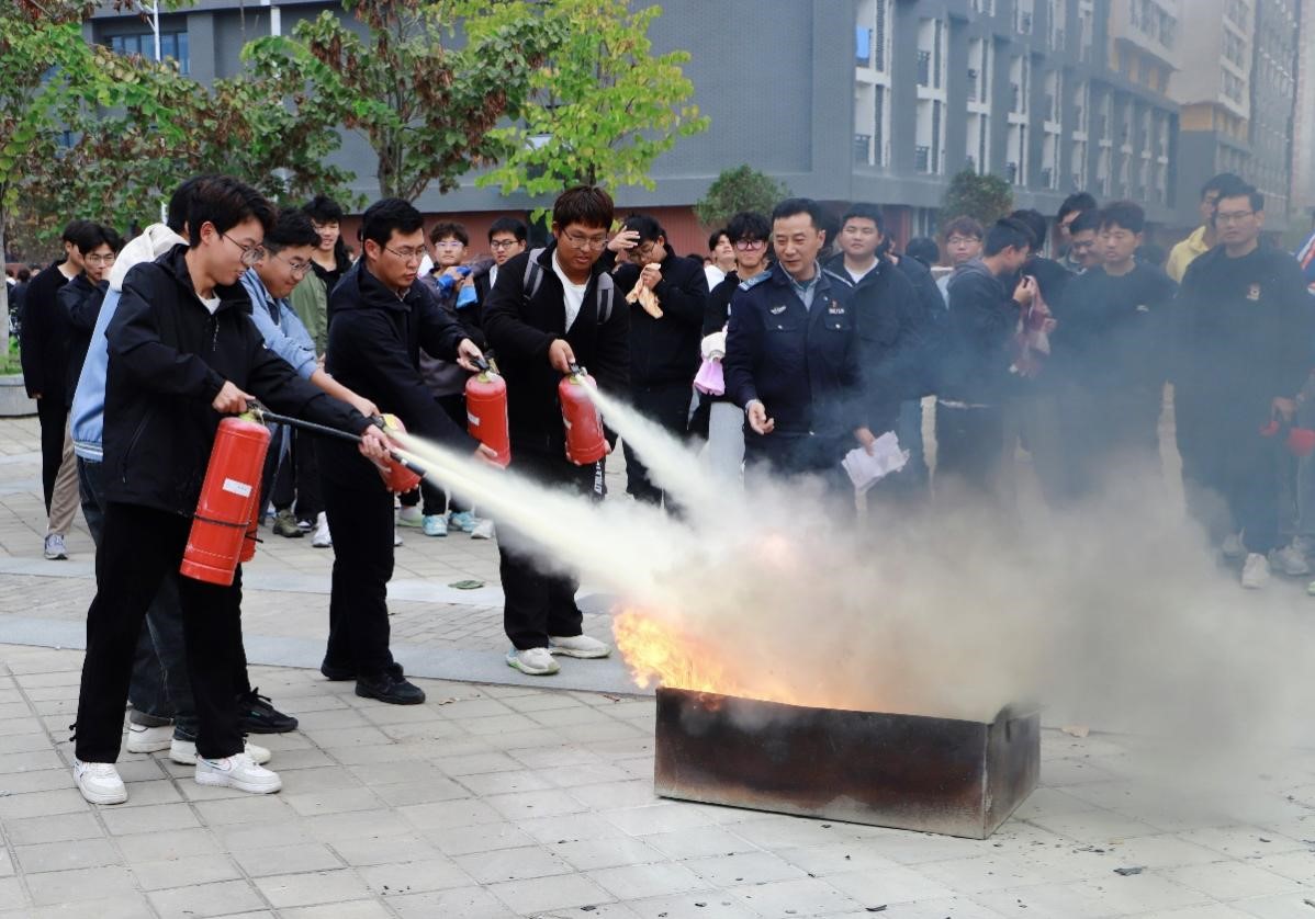 为巩固演练实践效果,保卫处老师讲解了火灾预防和提高应急处置能力的重要性,并现场指导了学生如何正确使用灭火器。接着,师生代表在保卫处老师的指导下,按照“一提二拔三压四喷”的灭火步骤,动手进行“灭真火”的实战实训,做到了使用消防器材方法正确,动作规范。