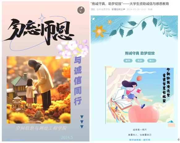 为了贯彻党的二十大精神,推进落实学生资助政策体系,全面覆盖彰显教育资助力量,扎实做好学生资助工作,切实将资助育人与学生个性化的成长成才需求相结合,加强对受助学生的诚信教育、感恩教育、励志教育和社会责任感教育,空间信息与测绘工程学院于2024年5月10日-6月8日开展了一系列资助育人主题教育活动。