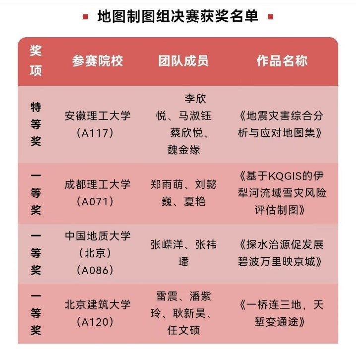 前期,我校积极遴选学生组建团队,在宫传刚老师的精心指导下打磨培育项目,积极备赛。经过名校荟萃、高手云集的决赛现场的激烈角逐,我校《地震灾害综合分析与应对地图集》作品凭借独特的创新思维、专业的制图技巧、精彩的汇报答辩脱颖而出,荣获地图制图组特等奖。