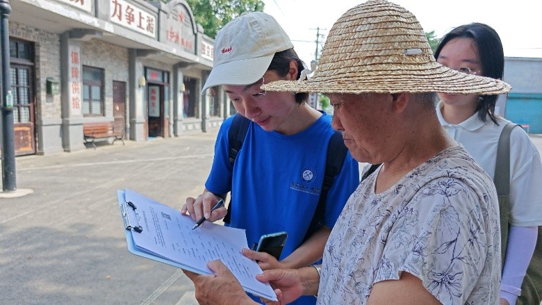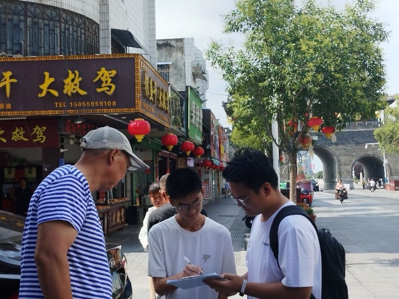 在国家历史文化名城寿县,团队成员实地考察了保存完好的宋代古城墙。同学们仔细观摩其独特的瓮城结构、防洪设计,深刻体悟这座“地下博物馆”的营城智慧与历史厚重感。结合考察中发现的实际问题,团队随即在古城内开展针对性调研,广泛收集居民和游客对古城保护与旅游开发的看法和建议。调研中,当地居民、游客积极参与,不仅分享了古城历史记忆,更围绕提升旅游标识清晰度、丰富文化体验、加强街区维护等提出了具体建议。