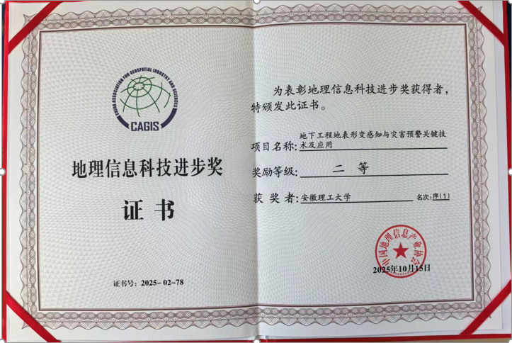 开幕式由中国地理信息产业协会副会长兼秘书长王增宁主持。会上颁发了2025地理信息科技进步奖、2025地理信息产业优秀工程、2025年优秀测绘工程、2025卫星导航定位科技进步奖、2025年卫星导航定位创新应用奖、第二十四届夏坚白测绘事业创业与科技创新奖等奖项。由我院王磊教授为第一完成人、安徽理工大学为第一完成单位合作完成的《地下工程地表形变感知与灾害预警关键技术及应用》项目获2025地理信息科技进步奖二等奖。